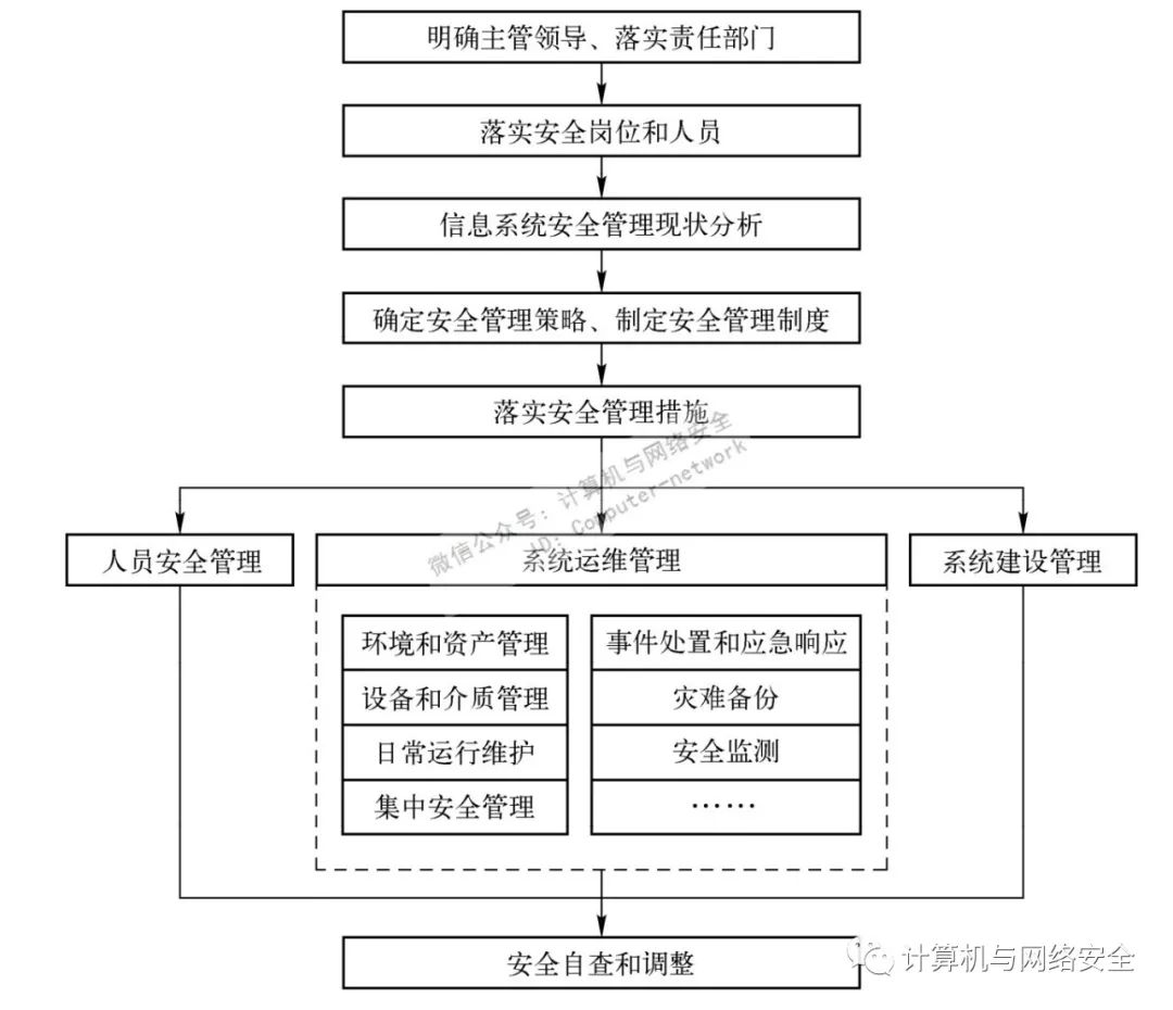 ② 三項重點工作。通過組織開展安全管理制度建設、技術措施建設和等級測評等三項重點工作,落實制度的各項要求。