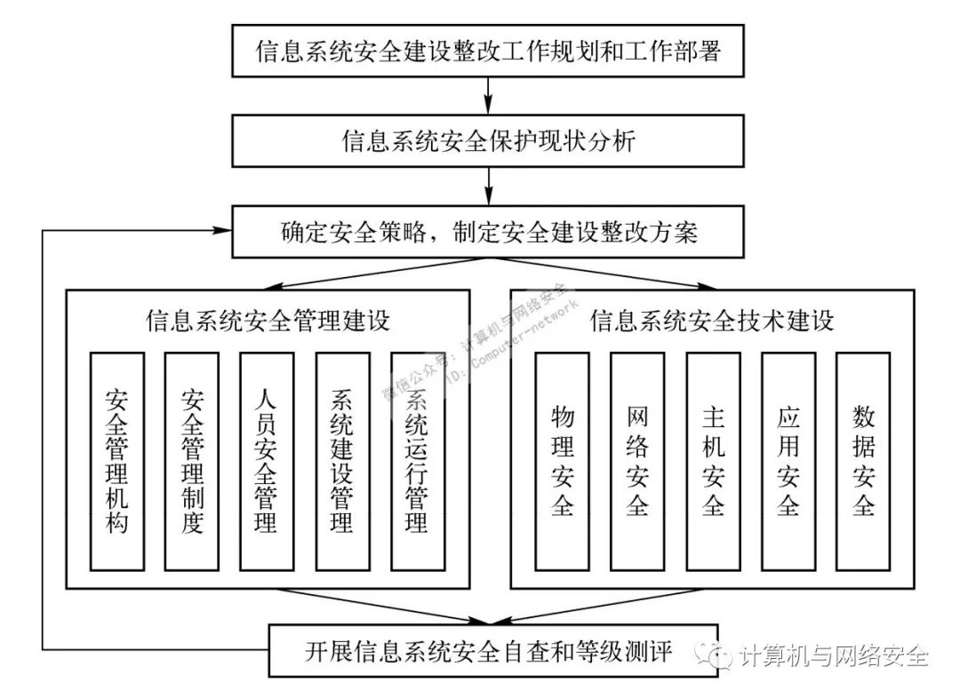 ② 三項重點工作。通過組織開展安全管理制度建設、技術措施建設和等級測評等三項重點工作,落實制度的各項要求。